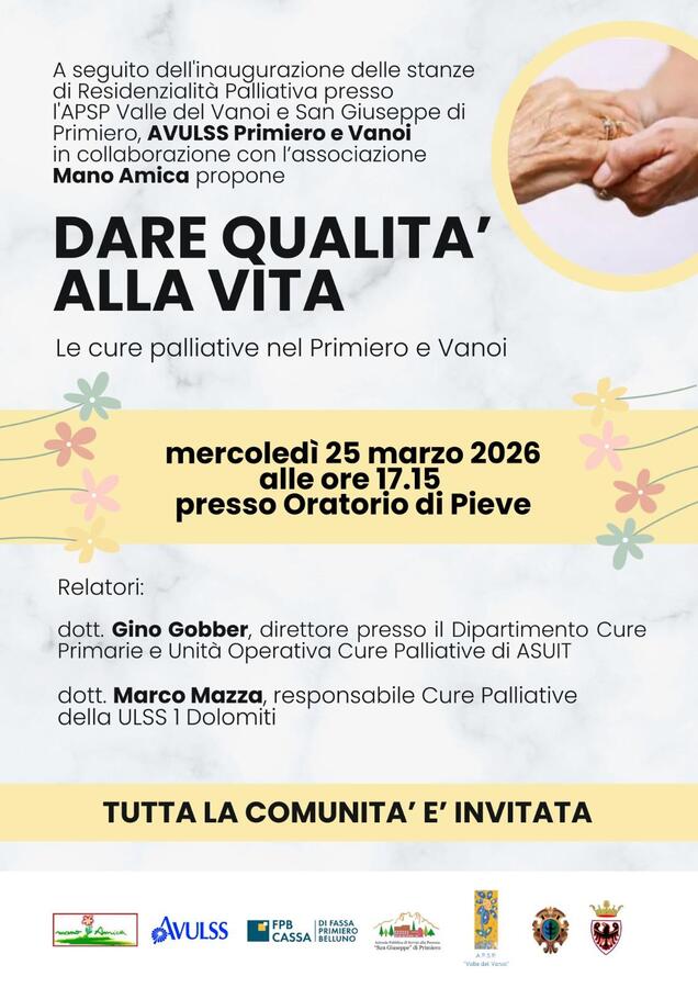 A seguito dell'inaugurazione delle stanze di Residenzialità palliativa presso l'APSP Valle del Vanoi e San Giuseppe di Primiero, AVULSS Primiero e Vanoi in collaborazione con l'Associazione Mano Amica, propongono un momento informativo sulle cure palliative nel Primiero e Vanoi.