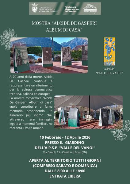 Mostra dedicata ad Alcide De Gasperi, aperta al territorio tutti i giorni dalle 8:00 alle 18:00 presso il giardino dell'A.p.s.p. "Valle del Vanoi"